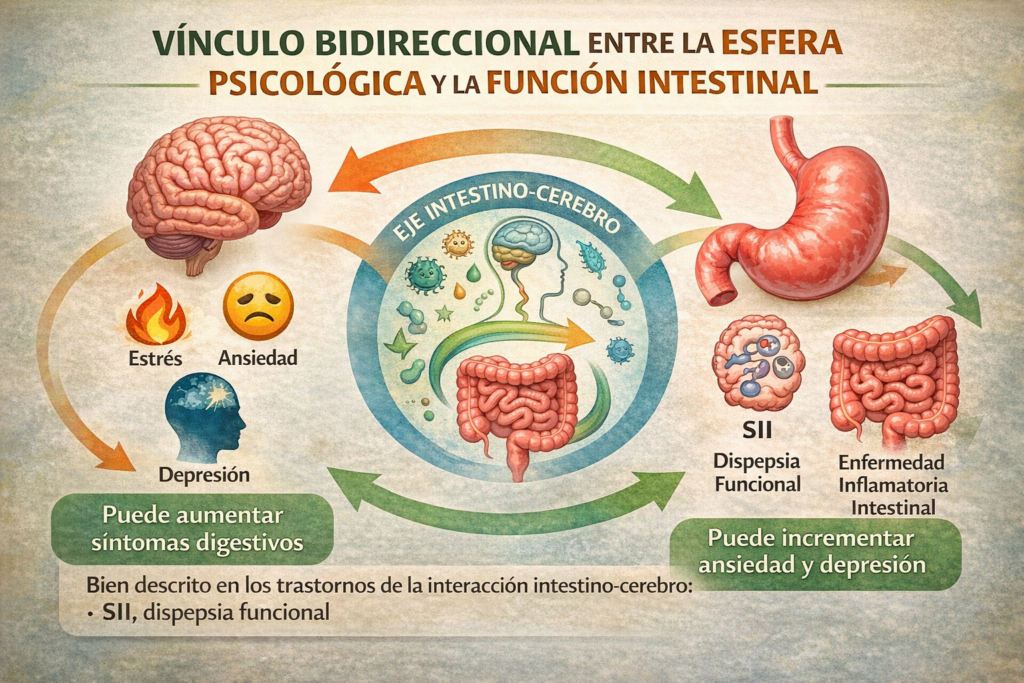 En este contexto, el estrés, la ansiedad y la depresión pueden modular la percepción del malestar digestivo y contribuir a su persistencia clínica, al tiempo que los síntomas intestinales crónicos pueden asociarse a un deterioro del bienestar psicológico y de la calidad de vida (Santos et al., 2025). En enfermedades intestinales orgánicas como la enfermedad inflamatoria intestinal, esta relación también parece relevante, aunque presenta una complejidad mayor, ya que la literatura reciente describe asociaciones entre inflamación intestinal, disbiosis, activación neuroinmune y una mayor carga de ansiedad y depresión, sin que ello autorice a reducir el problema a una explicación exclusivamente psicológica (Qian et al., 2025).