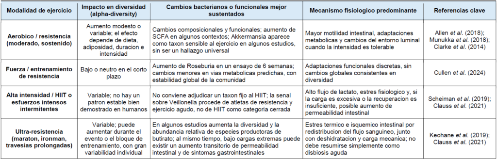 Dentro de este marco, el ejercicio de resistencia aeróbica es la modalidad que con mayor frecuencia se ha asociado a una microbiota intestinal más diversa dentro de cada individuo —es decir, con mayor variedad y mejor distribución de microorganismos— y a perfiles funcionales potencialmente favorables, incluidas rutas relacionadas con la producción de ácidos grasos de cadena corta. No obstante, esta asociación no es uniforme entre cohortes y puede verse modulada por variables como el volumen de entrenamiento, la ingesta proteica, el nivel competitivo y las características basales de la población estudiada.