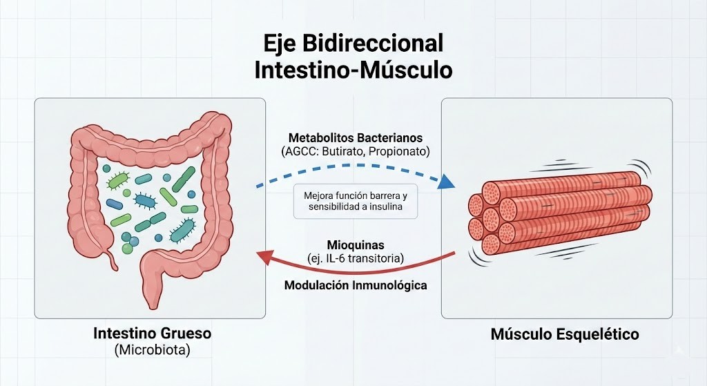 La relación entre ejercicio físico y salud digestiva debe formularse con cautela, porque sus efectos no son homogéneos y dependen tanto del plano de análisis como del contexto clínico. Desde una perspectiva fisiológica, la evidencia disponible indica que la microbiota intestinal participa de forma relevante en la regulación metabólica e inmunitaria del huésped y que puede intervenir en los mecanismos propuestos del denominado eje intestino-músculo. En humanos, el ejercicio físico puede modificar la composición y la función de la microbiota intestinal, aunque la magnitud y la dirección de estos cambios dependen del estado metabólico basal, del tipo de entrenamiento, de la duración de la intervención y del control dietético del protocolo (Allen et al., 2018; Clauss et al., 2021; Clarke et al., 2014; Ticinesi et al., 2019).
