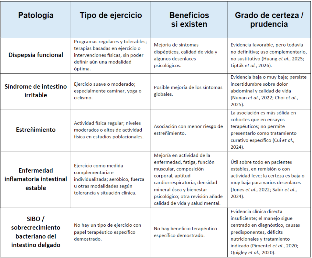 Muy distinta es la situación del sobrecrecimiento bacteriano del intestino delgado. En este contexto, las guías y revisiones de referencia siguen situando el manejo en el diagnóstico adecuado, la identificación y corrección de causas predisponentes, la corrección de déficits nutricionales y el tratamiento antibiótico cuando está indicado, sin atribuir al ejercicio un papel terapéutico específico. En conjunto, la evidencia disponible permite sostener que el ejercicio físico regular, preferentemente adaptado a la tolerancia del paciente y, en muchos contextos clínicos, de intensidad baja o moderada, puede actuar como herramienta complementaria útil en varios trastornos digestivos. Su respaldo clínico intervencional parece más consistente en el síndrome de intestino irritable y en la enfermedad inflamatoria intestinal estable; en el estreñimiento, la asociación es compatible con un posible beneficio, pero el soporte procede sobre todo de estudios observacionales; en dispepsia funcional, los resultados son prometedores, aunque todavía insuficientes para establecer una prescripción cerrada. En SIBO, por el contrario, la evidencia clínica directa sigue siendo insuficiente para fundamentar una recomendación específica (Pimentel et al., 2020; Quigley et al., 2020).