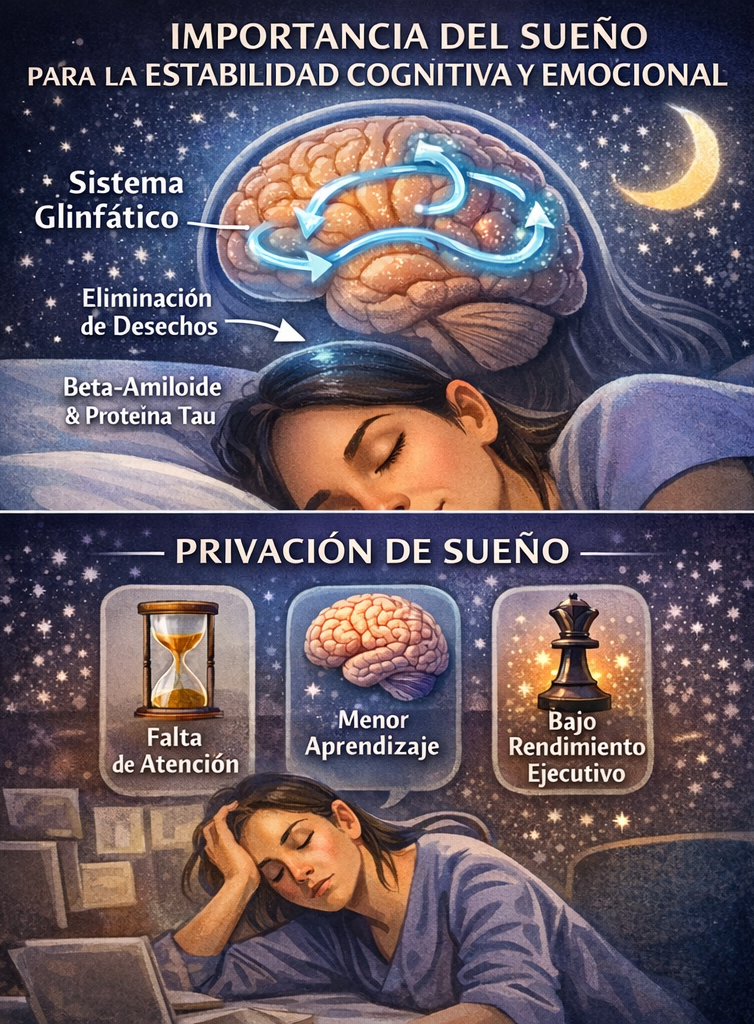 En los últimos años se ha propuesto que, durante el sueño, aumentan procesos de intercambio de líquido cefalorraquídeo y aclaramiento de desechos[1] en el encéfalo, en el marco de lo que se denomina sistema glinfático[2]. La literatura reciente sugiere que estos procesos pueden contribuir a la eliminación de metabolitos como beta-amiloide y tau[3], con evidencia especialmente consistente en modelos animales y una confirmación humana todavía más reciente y en pleno desarrollo (Dagum et al., 2026). De forma mucho más consolidada, la privación de sueño se asocia con peor atención sostenida, menor eficiencia del aprendizaje y peor rendimiento ejecutivo, con efectos acumulativos cuando la restricción se cronifica (Alhola & Polo-Kantola, 2007).