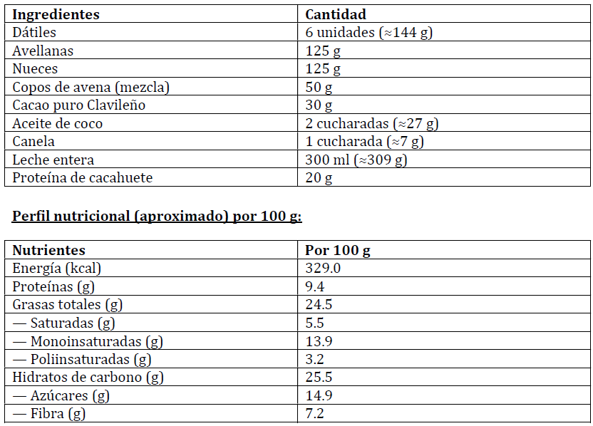 Sus ingredientes principales conforman un conjunto funcional: grasas insaturadas, fibra soluble e insoluble, minerales esenciales como el hierro no hemo (podemos acompañar una tostada de esta crema con un kiwi o mandarina, para favorecer la biodisponibilidad de este nutriente), el calcio, el zinc, y vitaminas del grupo B. Las avellanas y nueces, especialmente, nutren al feto sin desbordar el metabolismo materno, ayudando a estabilizar el perfil lipídico y reforzar la protección antioxidante. La avena, el cacao, los dátiles y la leche completan este mosaico con una combinación de hidratos de absorción gradual, compuestos fenólicos y aminoácidos estructurales.