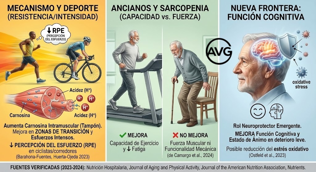 En adultos mayores, una revisión sistemática reciente (de Camargo, & Brigatto, 2024) introduce una distinción clínica decisiva: con dosis de 2,4–3,2 g/día, la beta-alanina puede mejorar la capacidad de ejercicio y reducir la fatiga percibida, pero no muestra efectos consistentes sobre la fuerza muscular ni sobre la funcionalidad mecánica (por ejemplo, levantarse de una silla o el equilibrio), por lo que no debería plantearse como tratamiento único frente a la sarcopenia —donde el ejercicio físico adaptado y la alimentación juegan el papel principal e inamovible como estrategia de referencia—. A ello se suma una línea emergente de investigación con interés extra-deportivo: ensayos en mayores sugieren mejoras en función cognitiva y estado de ánimo tras la suplementación, junto con cambios en marcadores relacionados con inflamación y estructura cerebral, lo que abre una vía prometedora que aún exige confirmación clínica más amplia antes de trasladarla a recomendaciones generales (Ostfeld et al., 2023; Ostfeld et al, 2024).