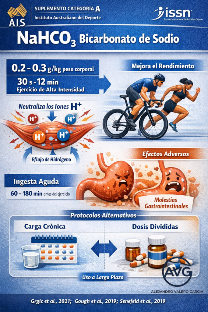 El bicarbonato de sodio (NaHCO₃) se ha consolidado como un suplemento de categoría A para el Australian Institute of Sport, respaldado por una lógica fisiológica clara: elevar la capacidad amortiguadora extracelular y, con ello, sostener el rendimiento cuando el esfuerzo de alta intensidad empuja al músculo hacia la acumulación rápida de protones[1]. En su posicionamiento, la Sociedad Internacional de Nutrición Deportiva (ISSN, por sus siglas en inglés) indica que dosis de 0,2–0,3 g/kg de peso corporal son eficaces para mejorar el rendimiento en tareas de predominio glucolítico con duraciones aproximadas de 30 segundos a 12 minutos (Grgic et al., 2021). El mecanismo central consiste en favorecer el eflujo de iones de hidrógeno (H⁺) desde el interior de la fibra muscular hacia el espacio extracelular, amortiguando la caída del pH asociada a la acidosis metabólica y retrasando la fatiga en ese rango temporal de esfuerzo. En la práctica, la pauta aguda —administrada 60–180 minutos antes del ejercicio— sigue siendo la más utilizada, pero metaanálisis recientes señalan que los efectos gastrointestinales adversos son frecuentes y pueden neutralizar la ventaja ergogénica; por ello, se han propuesto protocolos de carga crónica y, sobre todo, estrategias de dosis fraccionada como alternativas razonables para preservar el efecto minimizando el malestar (Gough et al., 2019; Senefeld et al., 2019).