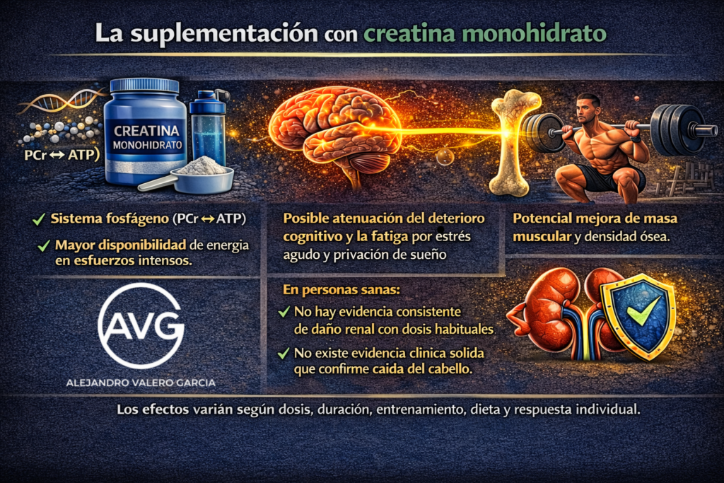 La suplementación con creatina monohidrato (CrM, a partir de ahora) se reconoce actualmente como un modulador crítico del metabolismo energético celular a nivel sistémico, trascendiendo su uso tradicional en el rendimiento anaeróbico. Su función principal es la saturación de los depósitos de fosfocreatina, lo que permite mantener el ratio ATP[2]/ADP durante esfuerzos de alta intensidad y optimizar la resíntesis de glucógeno muscular (Kreider et al., 2017). Sin embargo, la vanguardia de la investigación destaca su papel en la salud cerebral; al actuar como una «lanzadera» (utilizan, concretamente, la palabra shuttle) de energía en neuronas y células gliales[3], la creatina ha demostrado mitigar el deterioro cognitivo inducido por el estrés agudo, la privación de sueño y posibles lesiones cerebrales traumáticas leves (Candow et al., 2023; Rawson et al., 2023). Investigaciones publicadas recientemente, como la de Mills y colaboradores (2024), han ampliado este espectro, demostrando que la suplementación de CrM combinada con entrenamiento de fuerza mejora significativamente la densidad mineral ósea en poblaciones adultas, combatiendo la osteosarcopenia.