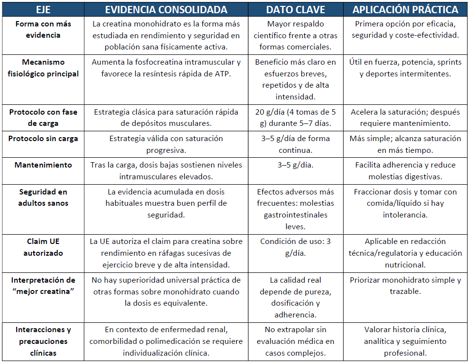 A nivel regulatorio europeo, la alegación autorizada es precisa y no admite interpretaciones amplias: la creatina mejora el rendimiento físico en series sucesivas de ejercicio breve y de alta intensidad, siempre que se consuma una dosis de 3 g/día (EFSA NDA Panel, 2011; Comisión Europea, 2012). Por lo tanto, la conclusión técnicamente rigurosa no es que exista una “creatina universalmente superior” para cualquier persona y contexto, sino que el monohidrato sigue siendo la forma de referencia por solidez de evidencia, y que su uso debe ajustarse al objetivo, la dosis eficaz y la situación clínica individual (Ashtary-Larky et al., 2025; NIH ODS, s. f.).