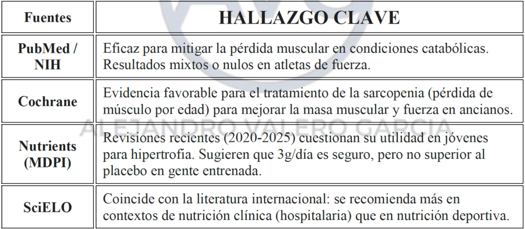 Como veredicto, el HMB es un suplemento de vida media plasmática corta (aproximadamente 2–3 horas), con un perfil de seguridad favorable; su utilidad es más verosímil como apoyo para atenuar la pérdida musculoesquelética en contextos de desuso o catabolismo que como herramienta principal para obtener ganancias musculares en sujetos entrenados.