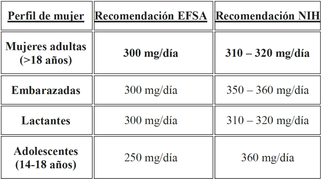 En el caso de mujeres adultas, la Autoridad Europea de Seguridad Alimentaria (EFSA, 2015) establece una AI de 300 mg/día procedentes de la dieta total. No obstante, en el ámbito de la suplementación, la EFSA determina un UL de 250 mg/día para las sales de magnesio (como el citrato o el bisglicinato), con el fin de prevenir efectos adversos gastrointestinales. En contraste, los Institutos Nacionales de Salud (NIH) de EE. UU. recomiendan una ingesta total de 310-320 mg/día, permitiendo hasta 350 mg/día en suplementos. La evidencia científica reciente (Sarić et al., 2025) destaca que mantener niveles séricos óptimos —preferiblemente por encima de 0.85 mmol/L— es fundamental durante la perimenopausia y la vejez para optimizar la salud ósea, la calidad del sueño y el rendimiento físico funcional.