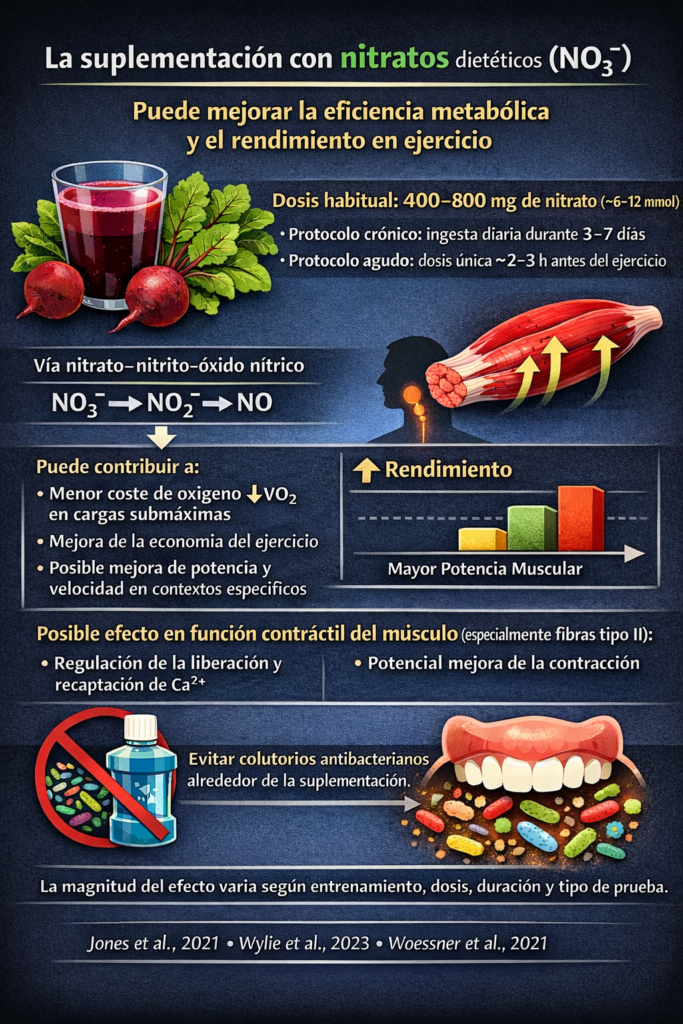 La suplementación con nitratos dietéticos (NO₃⁻) se ha consolidado como una de las ayudas ergogénicas con mayor respaldo científico para mejorar la eficiencia metabólica durante el ejercicio, sobre todo por su capacidad para optimizar la vía nitrato-nitrito-óxido nítrico. En términos fisiológicos, este mecanismo puede reducir el coste de oxígeno (VO₂) para una misma carga de trabajo y, por tanto, mejorar la economía del esfuerzo (Jones et al., 2021). Investigaciones recientes también subrayan su efecto sobre la función contráctil, especialmente en fibras musculares de tipo II, donde el óxido nítrico puede favorecer la dinámica del calcio y contribuir a una mayor potencia y velocidad de ejecución (Wylie et al., 2023). En cuanto a la pauta, los protocolos más utilizados sitúan la ingesta en 400–800 mg de nitrato, ya sea mediante una estrategia crónica de 3–7 días o en una dosis aguda única administrada unas 2,5–3 horas antes del esfuerzo. Un detalle a tener en cuenta es evitar colutorios antibacterianos, ya que alteran la microbiota oral responsable de la reducción inicial de nitrato a nitrito y pueden atenuar el efecto ergogénico (Woessner et al., 2021).